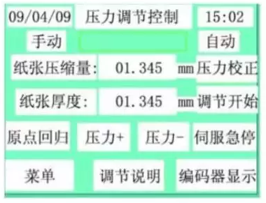 建立初始畫面,在畫面上分別設(shè)置按鈕開關(guān),在開關(guān)上分別寫上,壓力+、壓力-、原點回歸、自動調(diào)節(jié)、壓力校正、伺服急停等字樣,其中繼電器的對應(yīng)情況如上所寫。控制畫面如圖3和圖4。